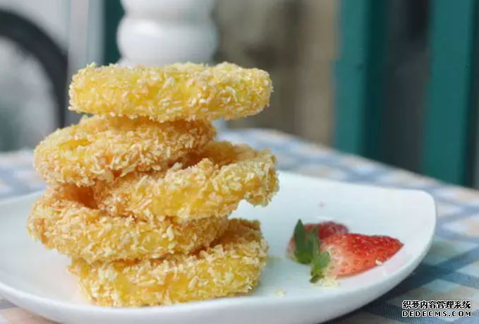 3.油燒至6成熱,蘋果圈炸至兩面金黃,控去多余的油分即可。